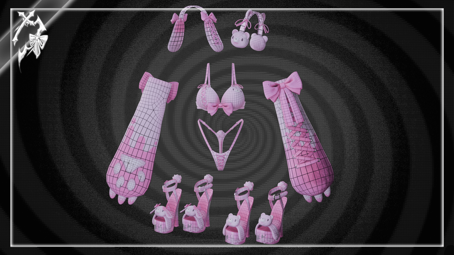 - Set is 101k tris (Earmuffs 6k, Bunny ears 13k 26k, Bikini 16k, Paws 21k, Both heel variations 41k)