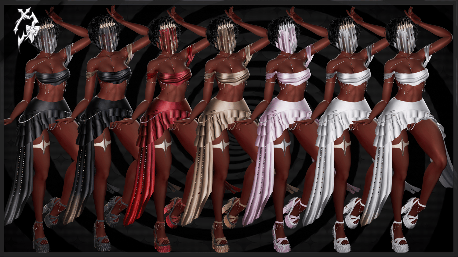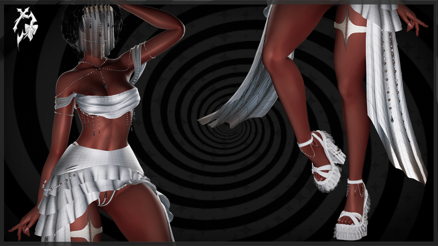 • pearltop, face veil, heel crystals, and skirt are all rigged